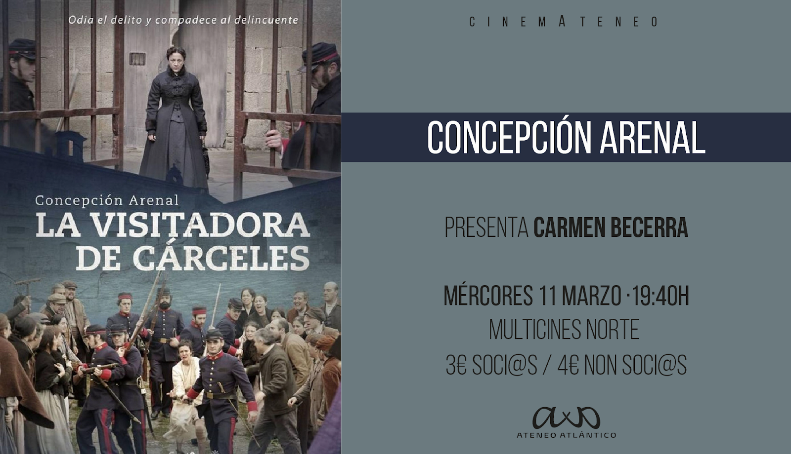 E, para iso, imos proxectar a película Concepción Arenal, a visitadora de cárceres, producida por Televisión Española en 2012.A película narra o período de mediados do século XIX en que Concepción Arenal, avogada, feminista e escritora, dedicou parte do seu tempo á función de visitadora de cárceres na prisión de mulleres da A Coruña. Este período será fundamental para configurar o seu pensamento e dará como resultado algunhas das súas obras clave; as reflexións e escritos desta fase da ferrolá servirán de base para a reforma do sistema penitenciario español.
