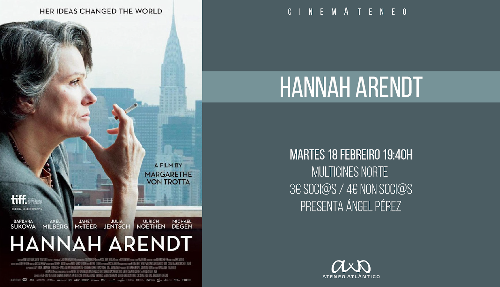 Sempre hai motivos, máis ou menos próximos, para achegarse ao pensamento teórico de Hannah Arendt. O concepto da “banalidade do mal” que ela introduciu, tense convertido nunha auténtica pedra filosofal para entender os acontecementos do noso presente. Moitas veces mal interpretada, dende o Ateneo Atlántico queremos achegarnos á súa obra e influencia da man da película que sobre ela se estreou no ano 2012 e do coloquio posterior, presentado por Ángel Pérez, do Seminario de Filosofía.