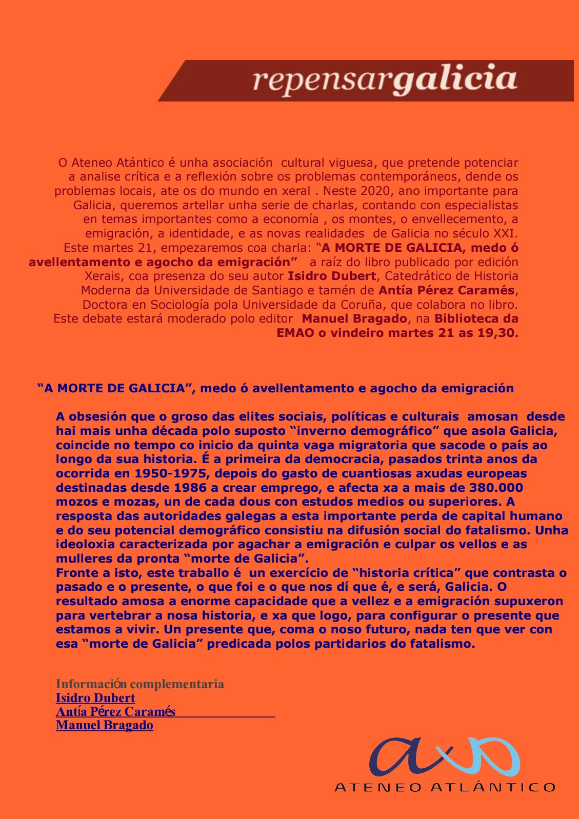 Cumprindo co seu compromiso de potenciar a análise crítica e a reflexión sobre os problemas contemporáneos, dos máis xerais aos máis locais, e ante a importancia para Galicia deste 2020 que vimos de inaugurar, o Ateneo Atlántico presenta un ciclo de actividades baixo o título xenérico de Repensar Galicia.