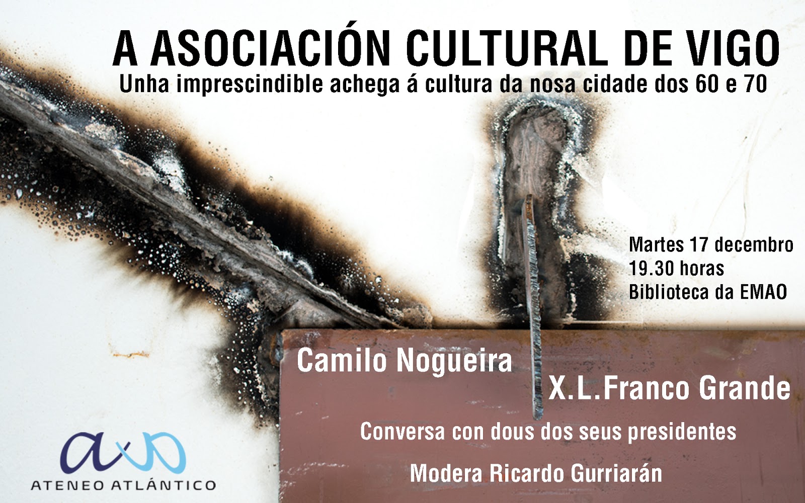 O próximo martes 17 de decembro, ás 19.30 horas, na biblioteca da Escola Municipal de Artes e Oficios (García Barbón), e co título ‘Asociación Cultural de Vigo. Unha imprescindible achega á cultura da nosa cidade dos 60 e 70‘ o Ateneo Atlántico