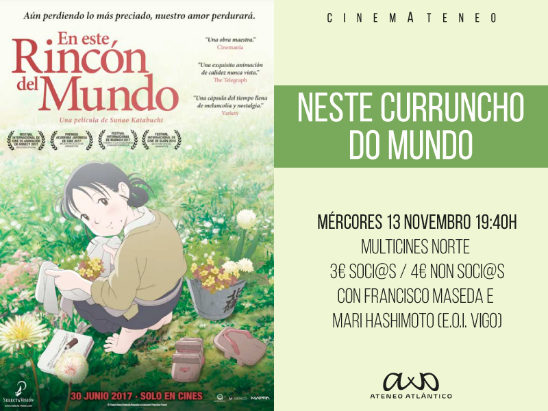 Dende o CinemAteneo, queremos proporvos unha película arriscada para esta primeira película da tempada. Pero é un risco que cremos que paga a pena con creces, pois “Neste curruncho do mundo” é unha excepcional película por si mesma, que pasou algo desapercibida por tratarse de animación para adultos. Centrada nos meses e días previos á caída da bomba de Hiroshima, a película vai envolvendo ao espectador nun mundo de cotidianeidade e afectos que se romperán de súpeto nun instante. Unha película de debuxo sinxelo e emocións complexas, que seguramente convencerá aos máis escepticos, afeccionados ou non ao cine de animación.