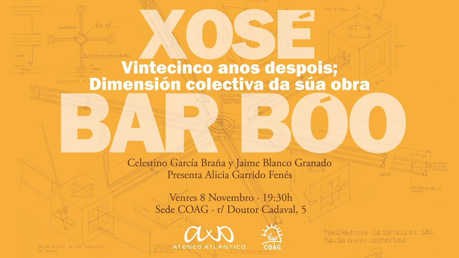 Cando se cumpren 25 anos do falecemento de Xosé Bar Bóo, dende o Ateneo Atlántico, coa colaboración da delegación do COAG-Vigo, queremos lembra-la obra do gran arquitecto vigués, facendo unha lectura inédita e novidosa do seu traballo. Será este Venres, día 8 de Novembro, na Sala de Conferencias da sede do Colexio de Arquitectos.