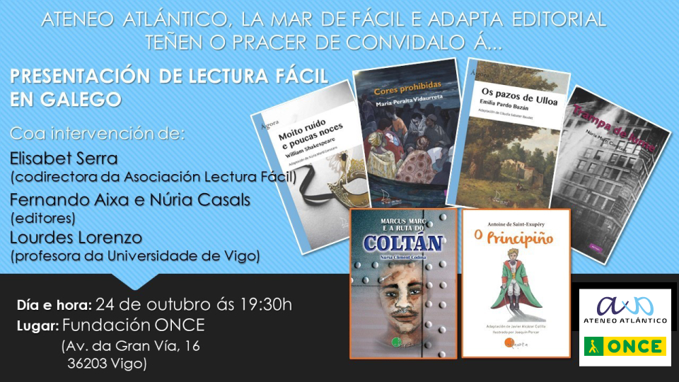 O pasado xoves 24 de outubro ás 19:30h, no Salón de Actos da Fundación ONCE de Vigo (Gran Vía, 16) a Asociación Lectura Facil e as editoriais Adapta e La mar de fácil, en colaboración co Ateneo Atlántico, presentaron diversos materiais didácticos ao obxeto de facilitar o acceso á lectura en galego das persoas cegas, xordas e neurodiverxentes, contribuindo así á súa plena inclusión.