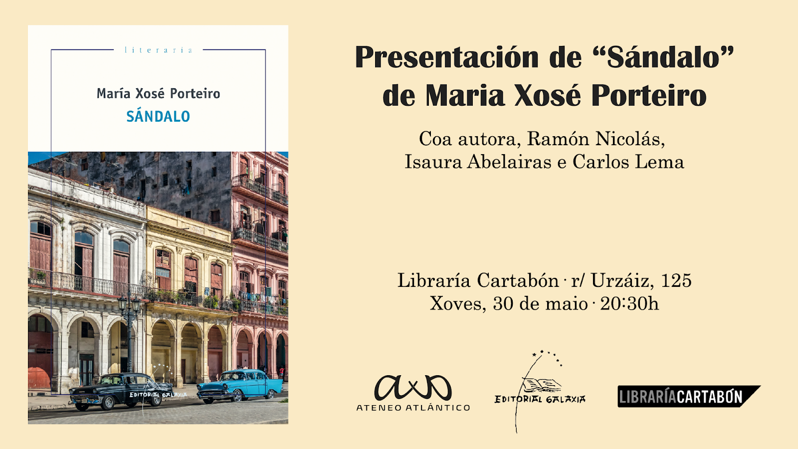 O xoves 30 de maio, o Ateneo Atlántico acompaña a Maria Xosé Porteiro na presentación da súa nova novela, “Sándalo“. Será na Libraría Cartabón, na rúa Urzáiz 125, a iso das 20:30h da tarde.