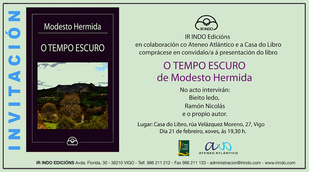 Este xoves 21 de Febreiro ás 19:30h, na Casa do Libro de Vigo, presentase “O Tempo Escuro”, un libro de relatos curtos do profesor Modesto Hermida.